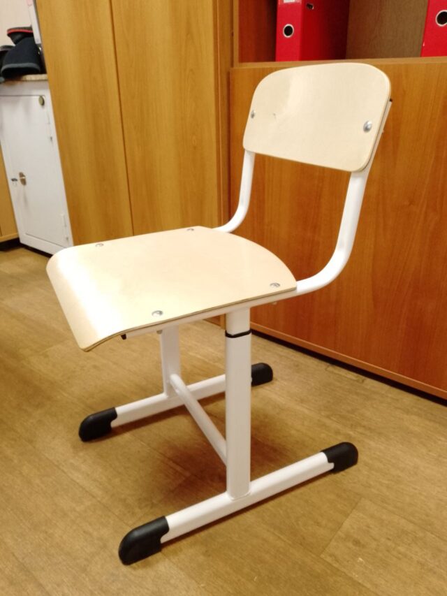 Современный , регулируемый по высоте стул, с сиденьем и спинкой их фанеры, на металлическом каркасе из плоскоовальной трубы.